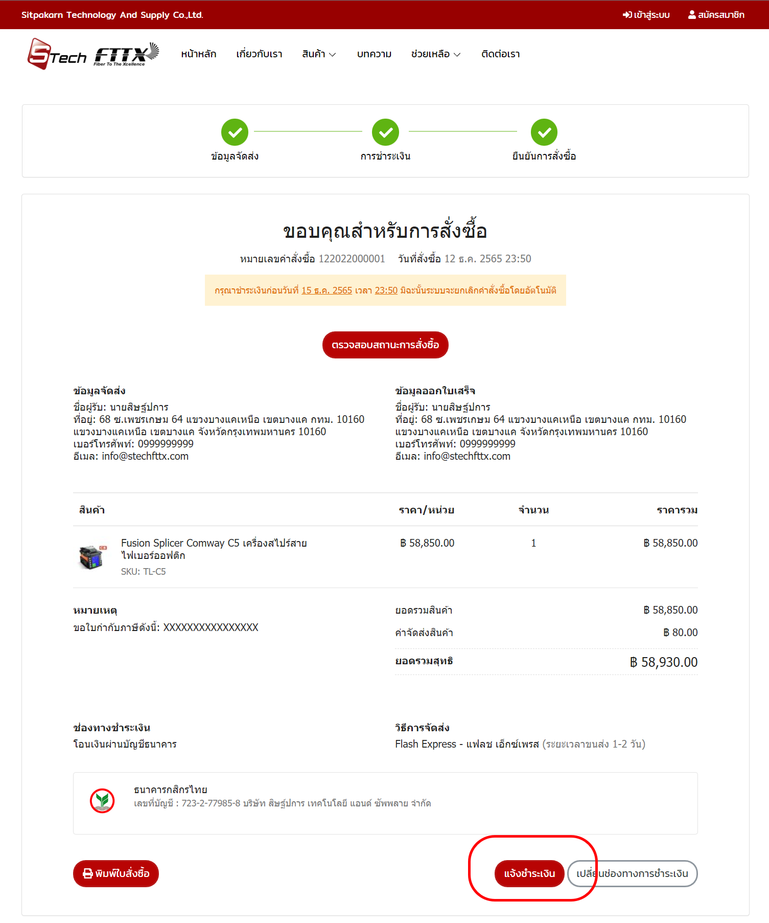 7. เมื่อเข้าสู่หน้ายืนยันการสั่งซื้อแล้วให้ทำการกดปุ่ม แจ้งชำระเงิน (สามารถกดปุ่ม พิมพ์ใบสั่งซื้อ หรือ ตรวจสอบสถานะการสั่งซื้อ เพื่อตรวจสอบยืนยันข้อมูลได้)